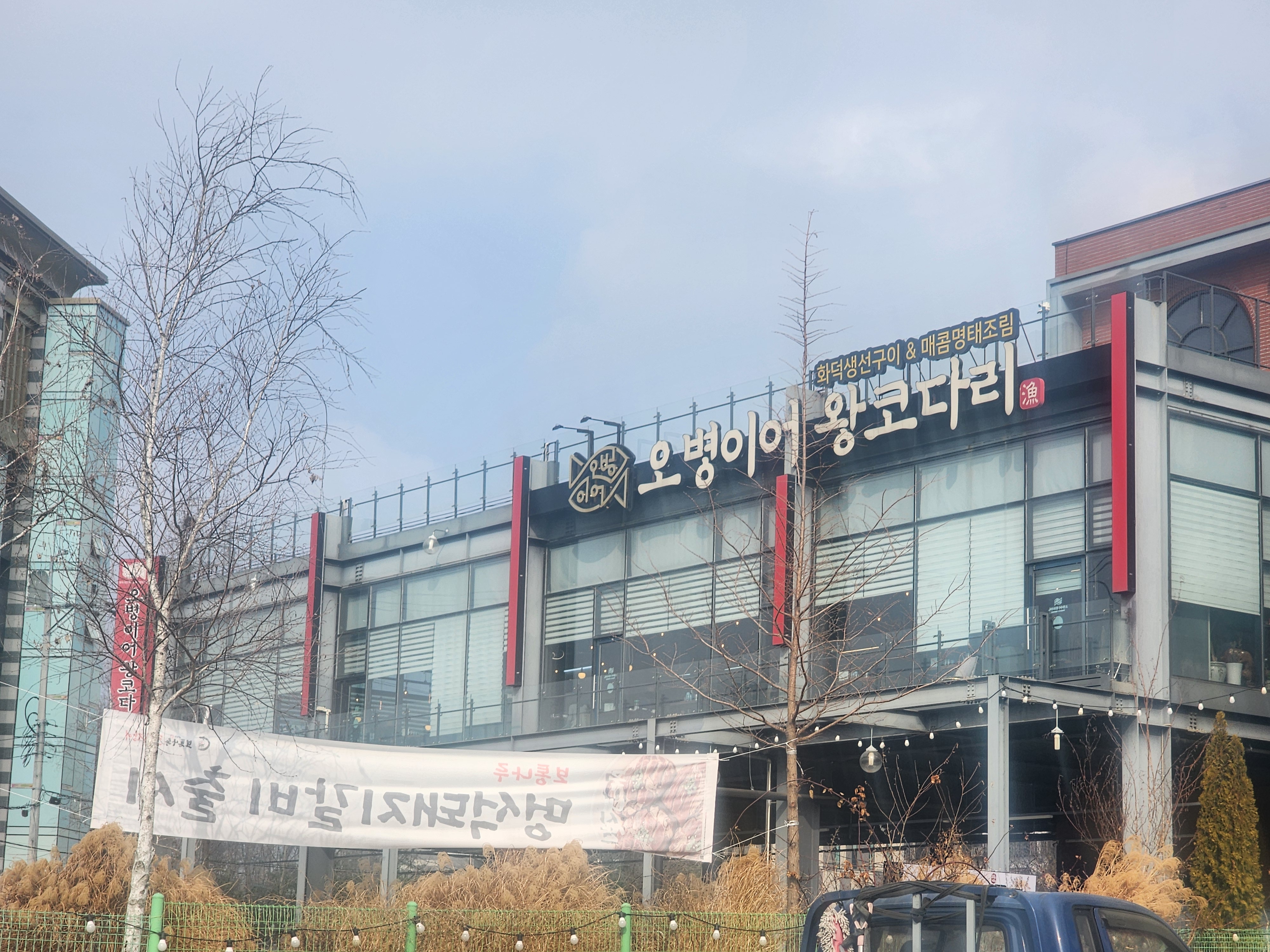 라운딩으로 에너지를 소비했으니 이제 보충할 시간! 차로 조금만 이동하면 닿는 **보통리 저수지 앞 '오병이어 왕코다리'**를 방문했습니다. 이곳은 이미 이 지역에서 소문난 맛집이라 기대가 컸어요.