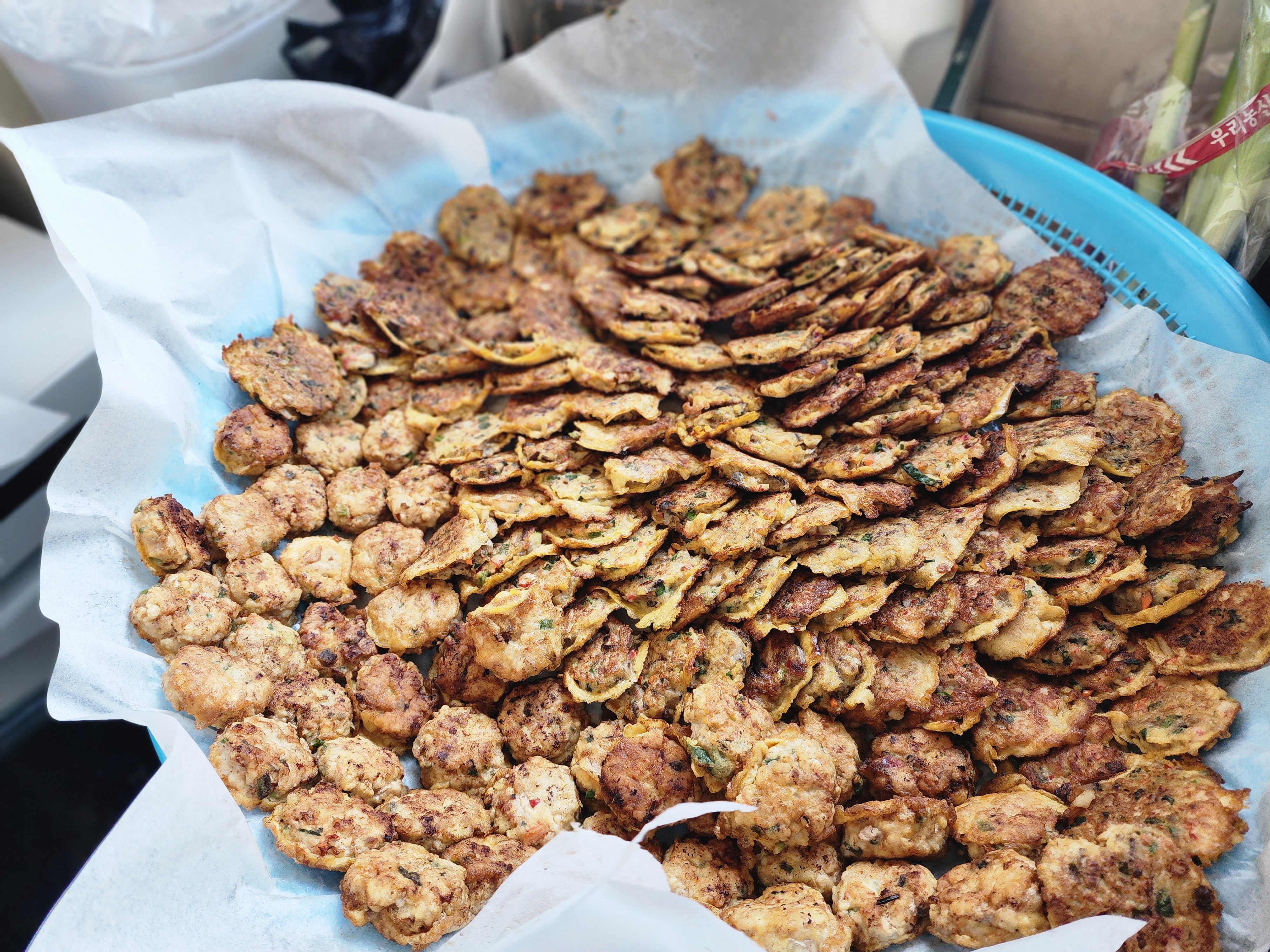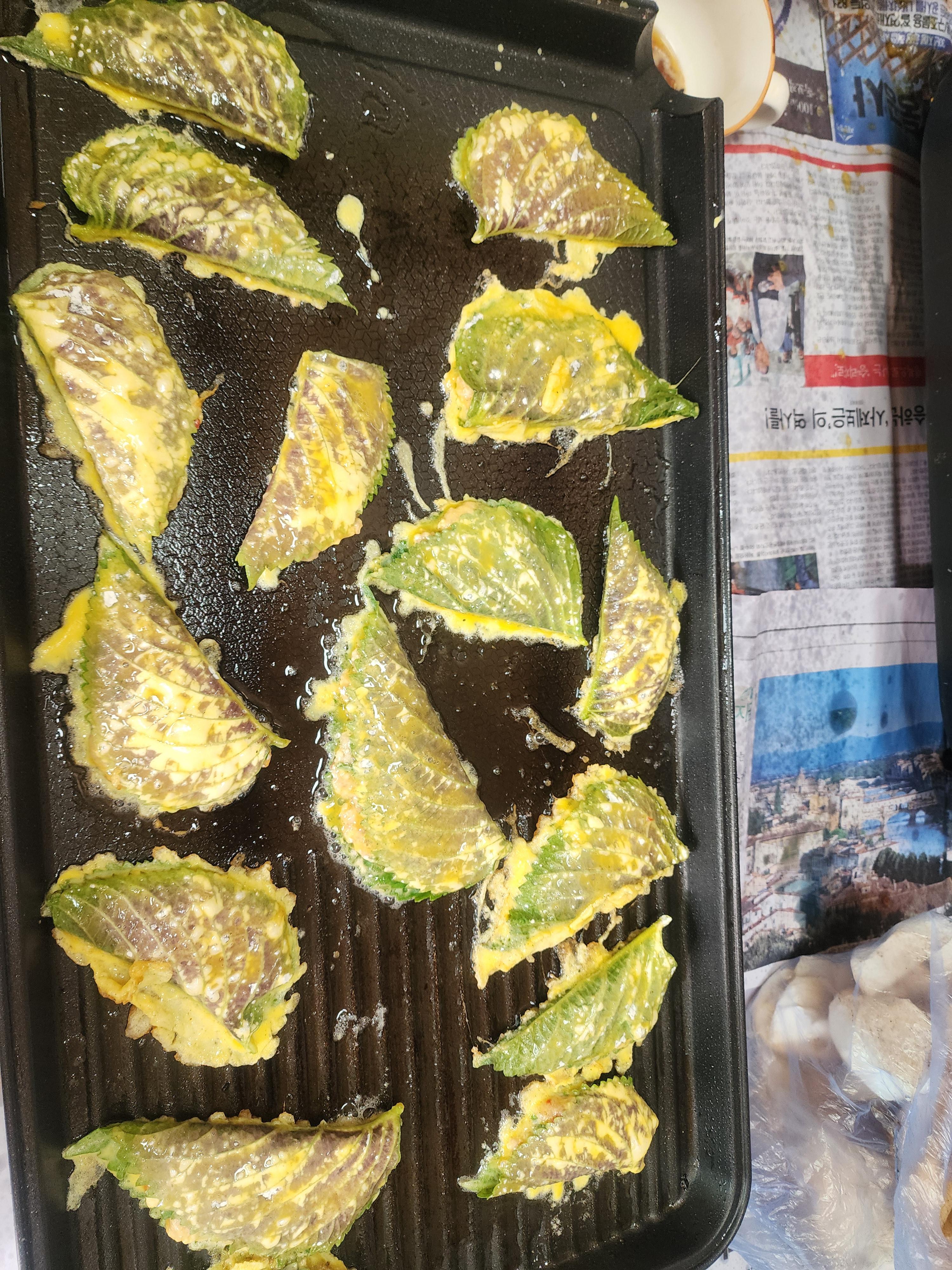 - 깻잎전: 향긋한 깻잎 사이에 다진 고기 반죽을 듬뿍 넣어 반으로 접어 부쳐냈어요. 깻잎 특유의 향이 고기의 느끼함을 잡아주어 무한 흡입 가능!