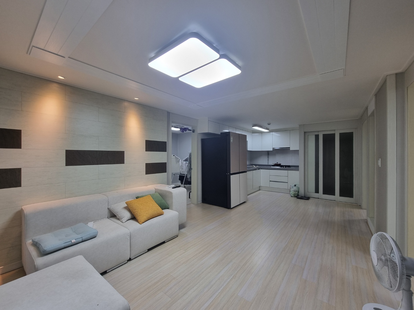 깔끔한 화이트톤 인테리어에 간접등까지 갖춘 거실, 벽걸이 TV 설치되어 있고 공간활용도 좋습니다.
