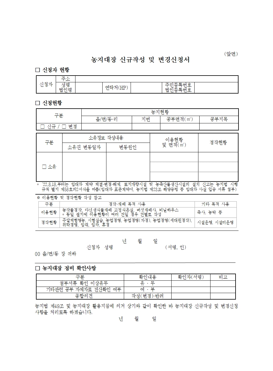 - 신분증 지참 후 접수창구에서 농지대장 발급 신청